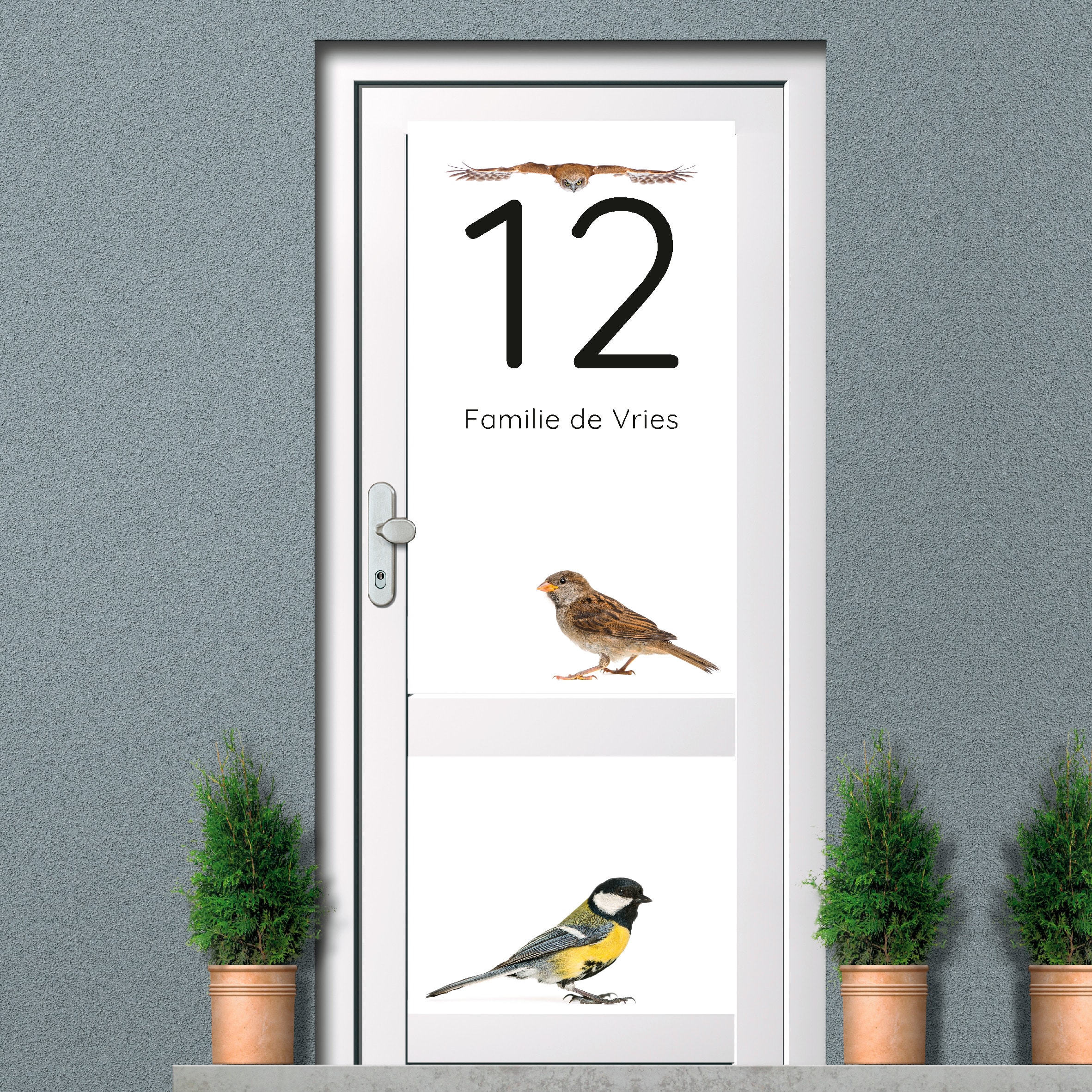 Raamfolie full colour 11B. Een raamfolie bedrukt met een ontwerp met vogels en eigen huisnummer en naam.